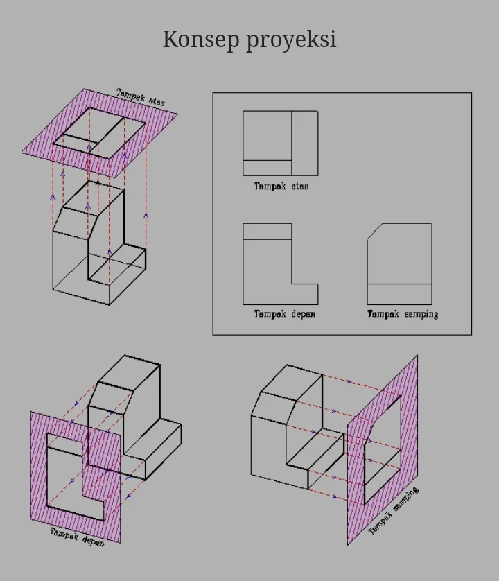 2. PROYEKSIProyeksi 2 dimensi adalah penerjemahan suatu benda bentuk 3 dimensi kedalam bentuk 2 dimensi, artinya benda tersebut digambarkan hanya dari salah satu sudut pandang, dan oleh sebab itu gambar proyeksi 2 dimensi hanya memiliki dua komponen ukuran , yaitu panjang dan lebar. Kekurangan satu elemen ukuran yang lain yaitu ukuran tinggi dikompensasi dengan di buatkan proyeksi dari sudut pandang yang lain yang dapat memperlihatkan ketinggian benda tersebut. Apabila benda yang hendak diproyeksikan memiliki kerumitan yang tinggi, tidak menutup kemungkinan gambar proyeksi yang dibuat menampilkan banyak sudut pandang. Gambar tampilan proyeksi 2 dimensi diusahakan menampilkan sesedikit mungkin pandangan dengan memperhatikan faktor kerapian dan kemudahan pembacaan gambar